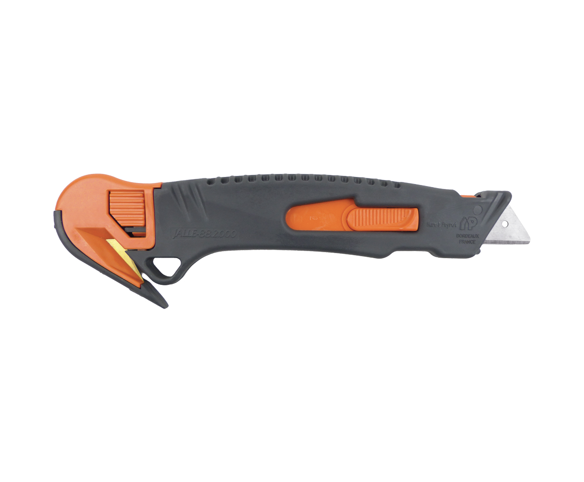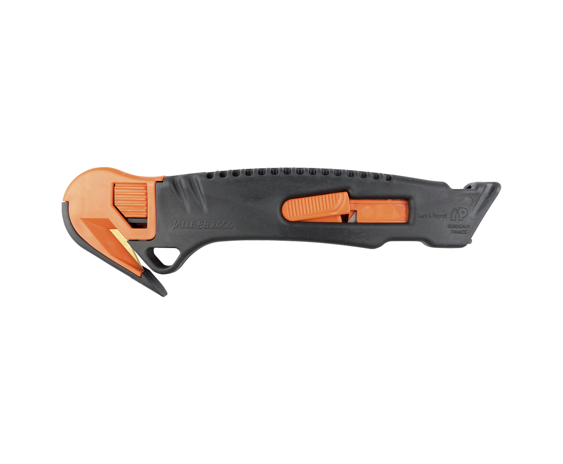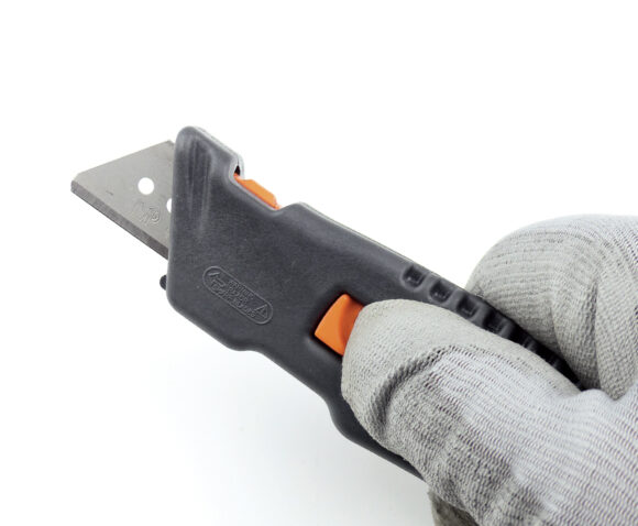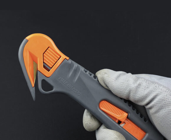 - auf der einen Seite mit automatisch einziehbarer Klinge, auf der anderen Seite zum Schneiden von Folien und Bändern